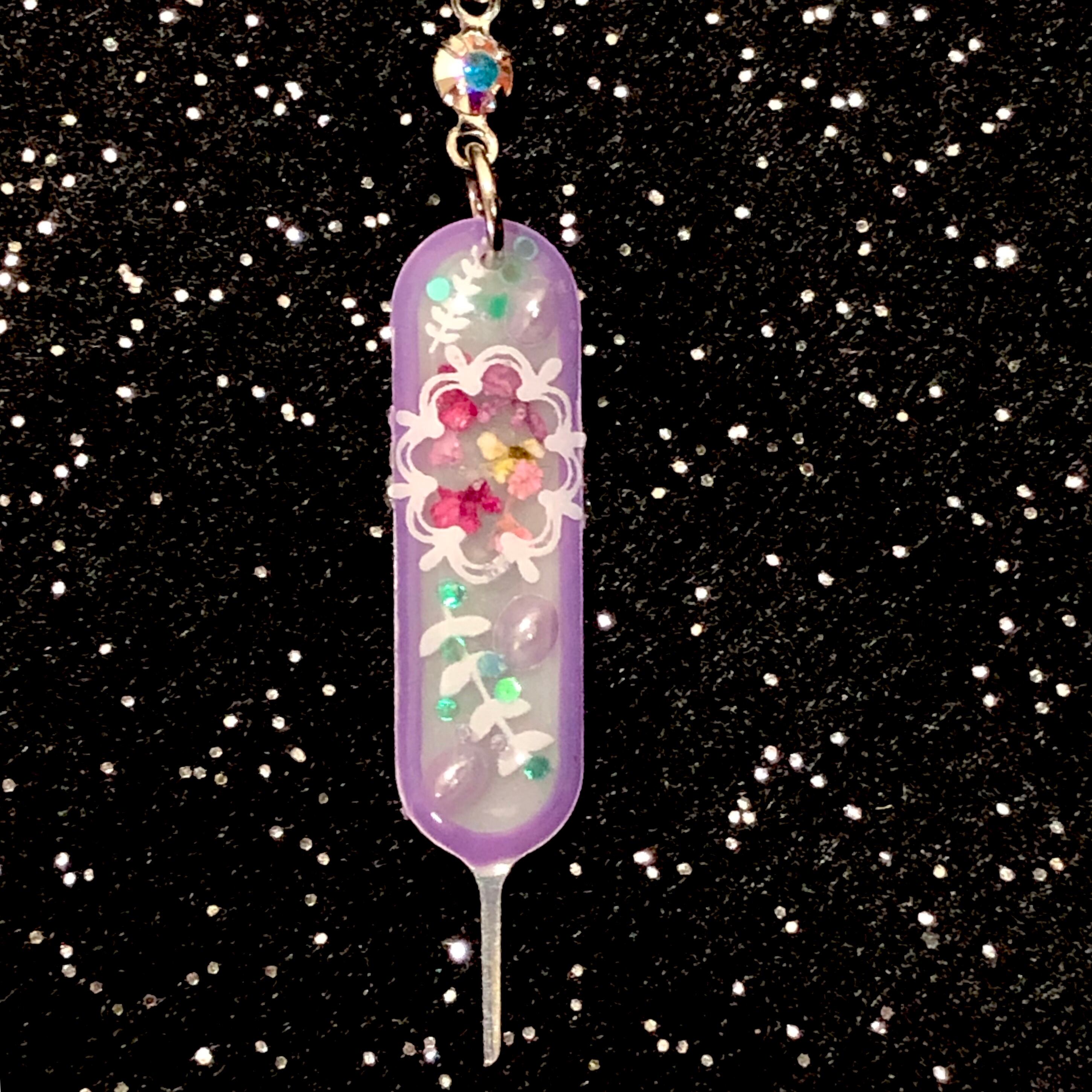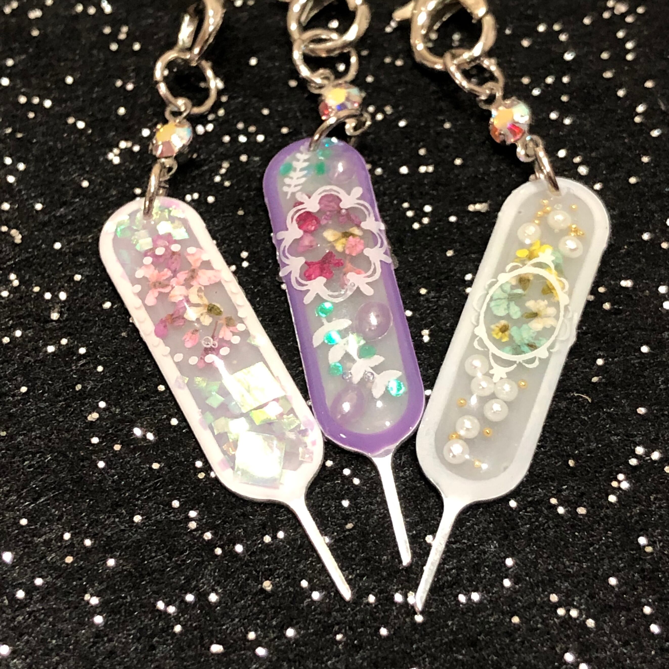 ミルキーホワイトのベースに小さなドライフラワーのお花をレース風のホワイトフレームで囲んでいます☆。.:*・゜