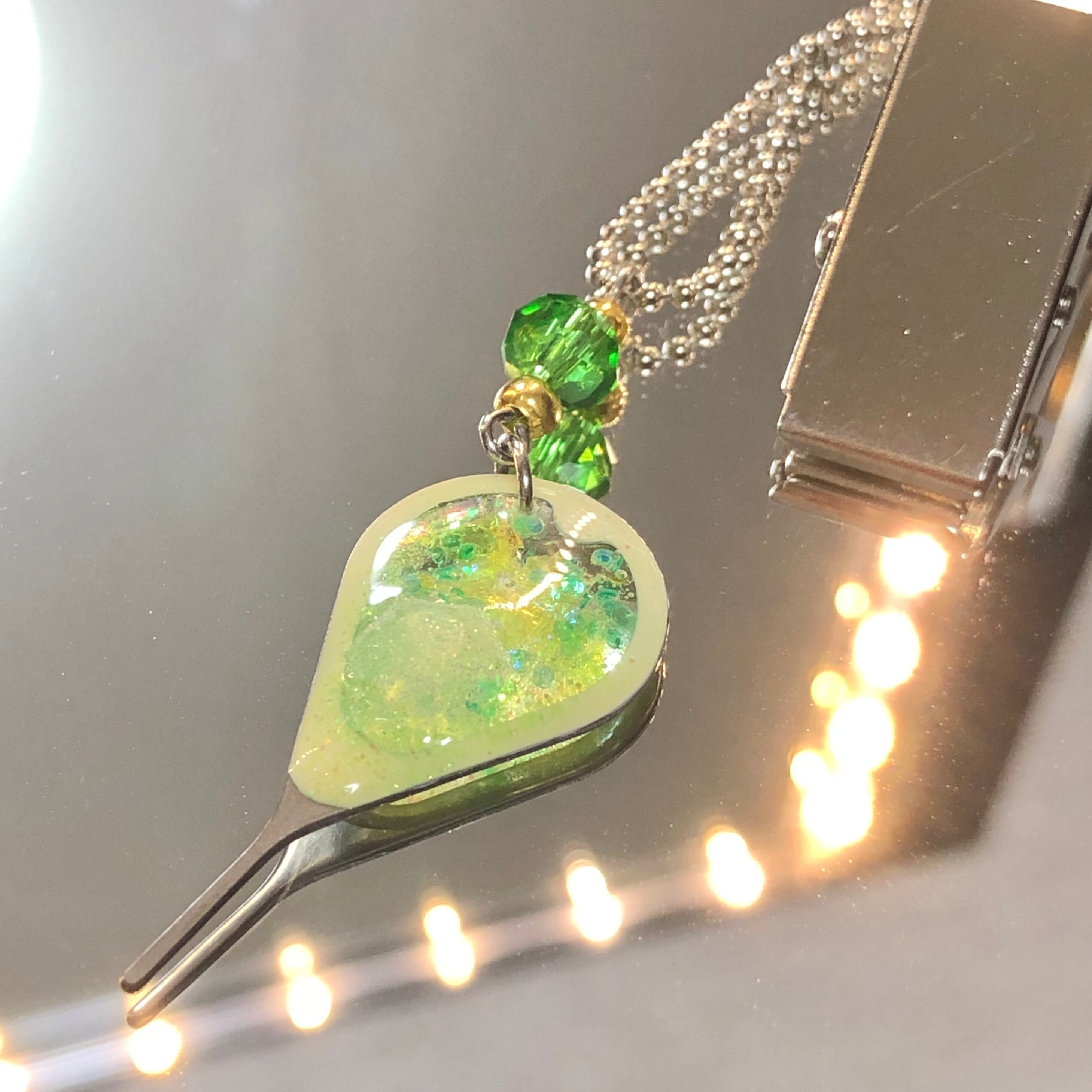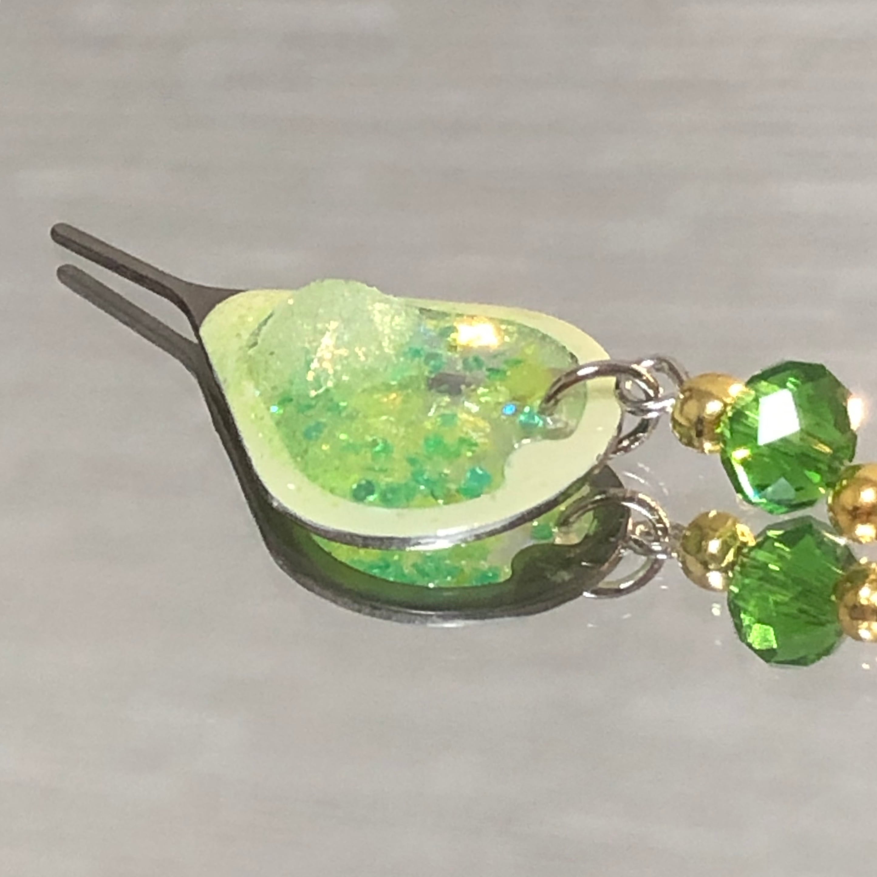 ティンクのシューズのイメージで氷砂糖のようなモチーフをあしらい、グリーンのチェコビーズをお付けした可愛らしいSIMピンです
