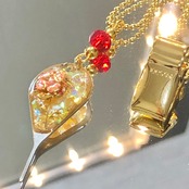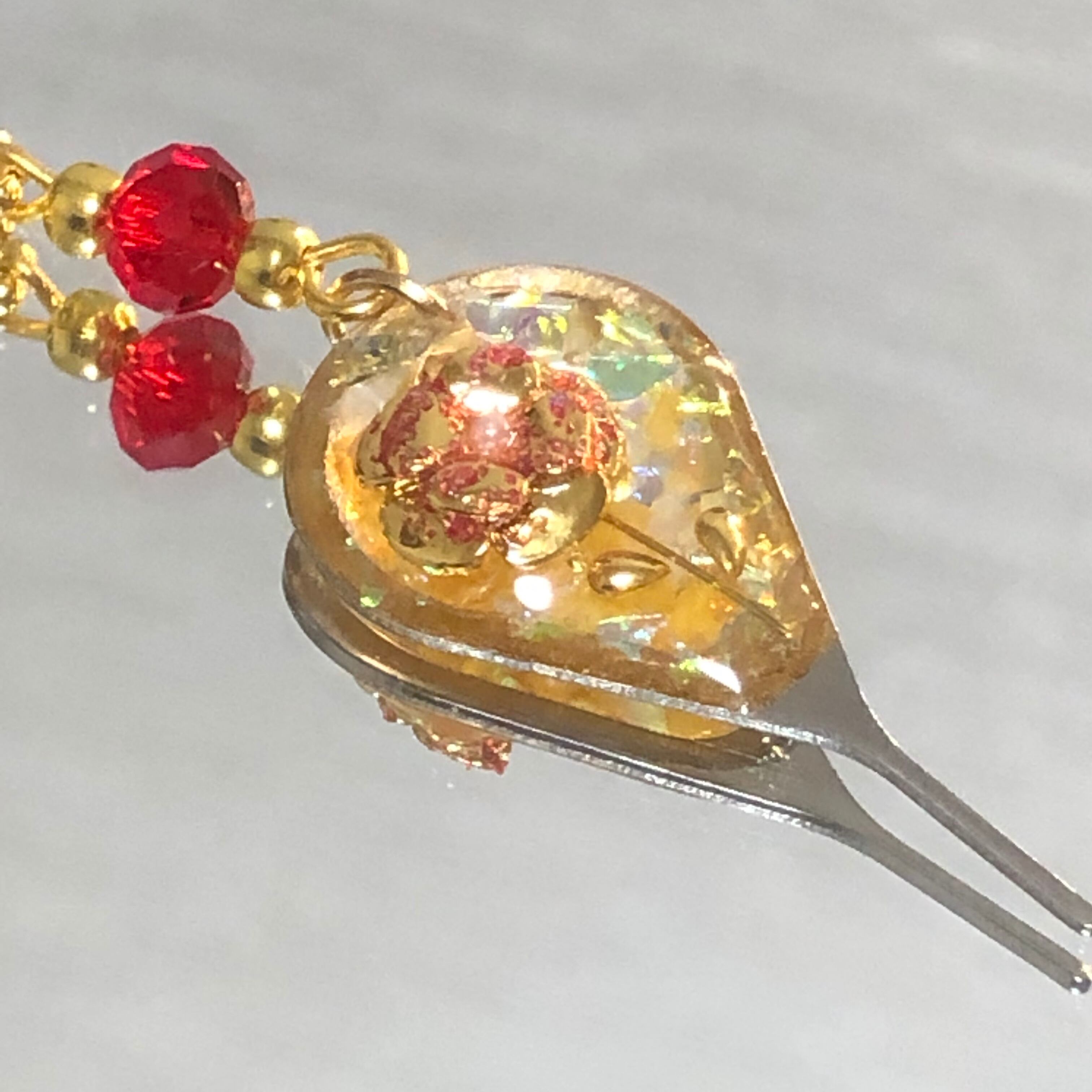 ゴールドの薔薇のモチーフにラメで色付けし、レッドのチェコビーズで更に華やかなイメージに仕上げたSIMピンです