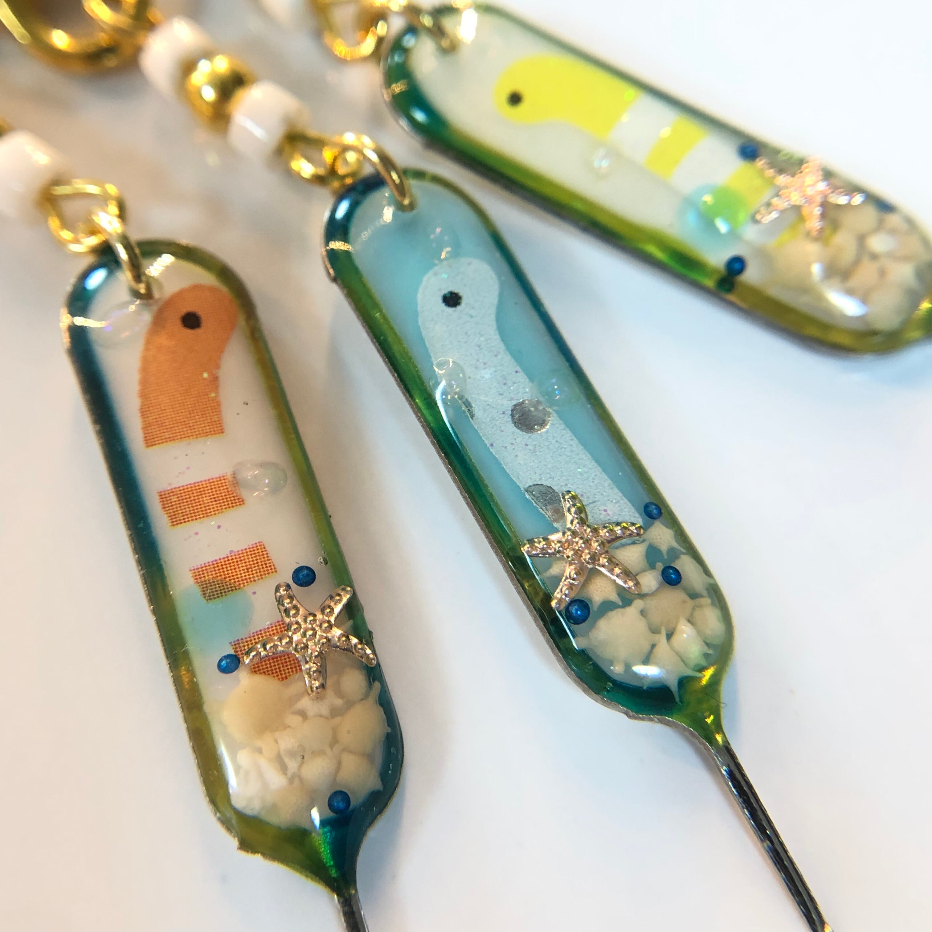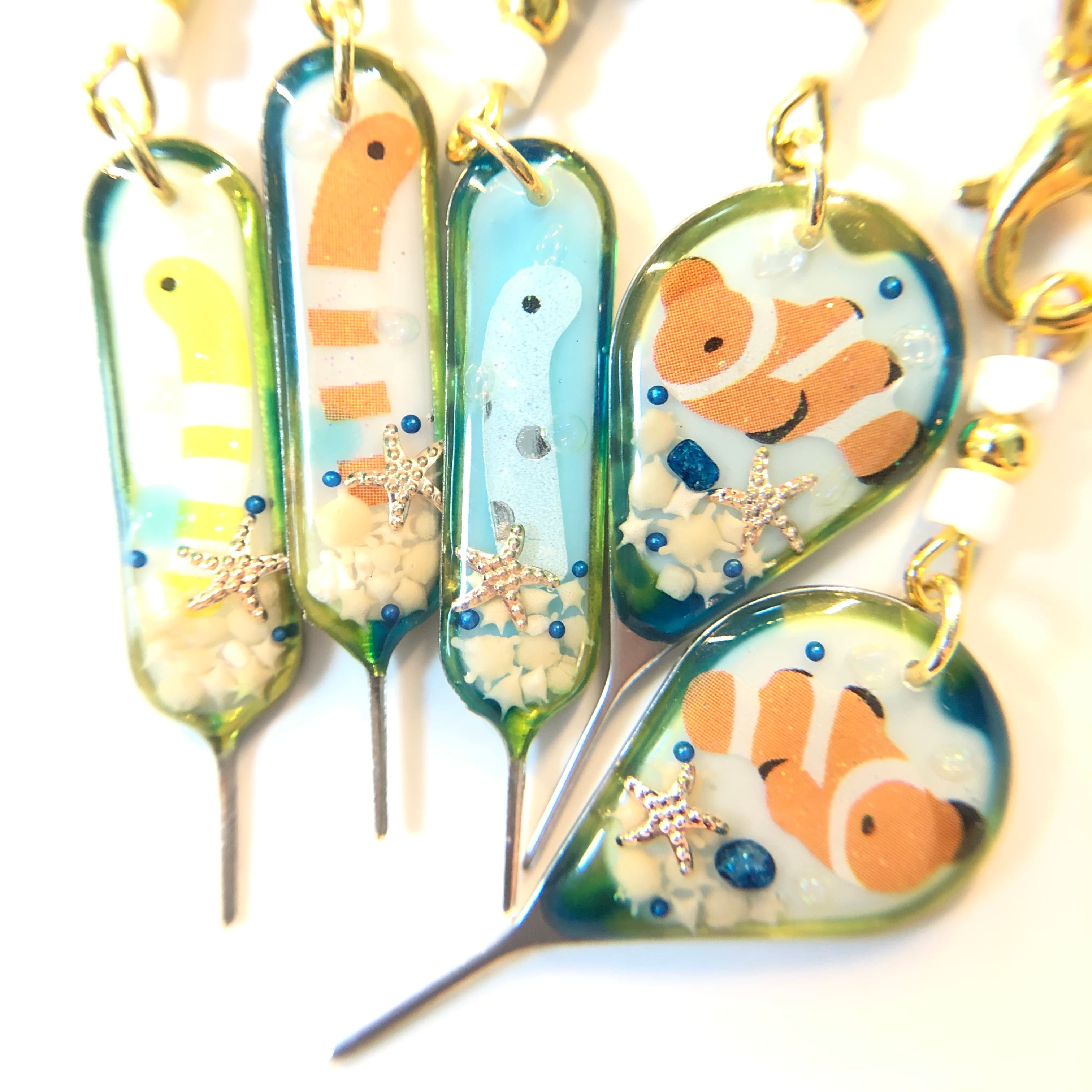 星の砂とスターフィッシュを封入し、その上からチンアナゴさんがひょっこりしている夏仕様のSIMピンです☆。.:*・゜