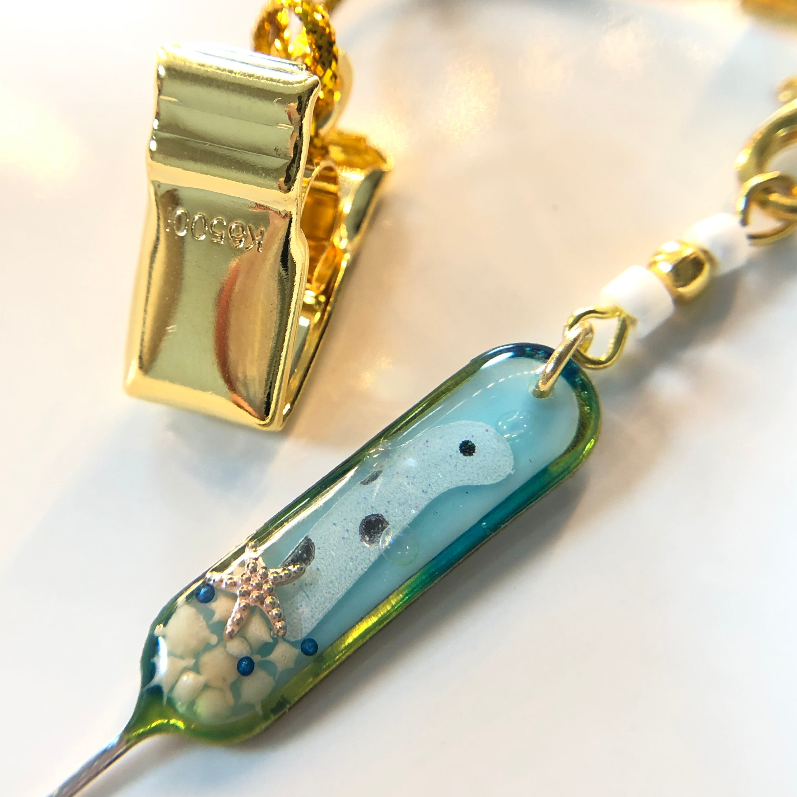 ボールチェーンを付け、更に無くさないよう胸ポケットやノートなどに挟めるクリップ金具を付けた【改良型】です☆。.:*・゜