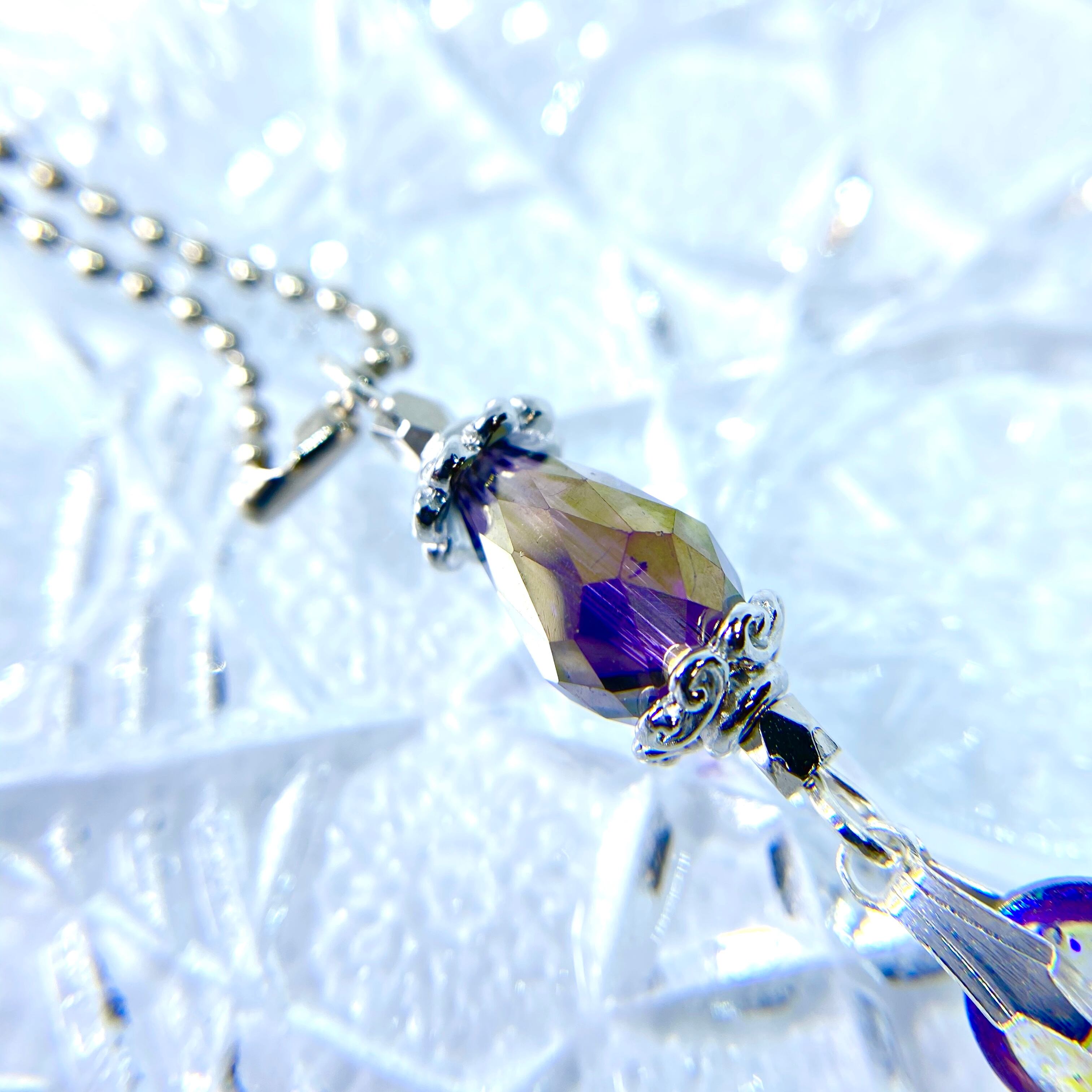 こちらの主役はメタルビーズで飾り付けた繋ぎのドロップ型ガラスビーズ!!存在感あります!