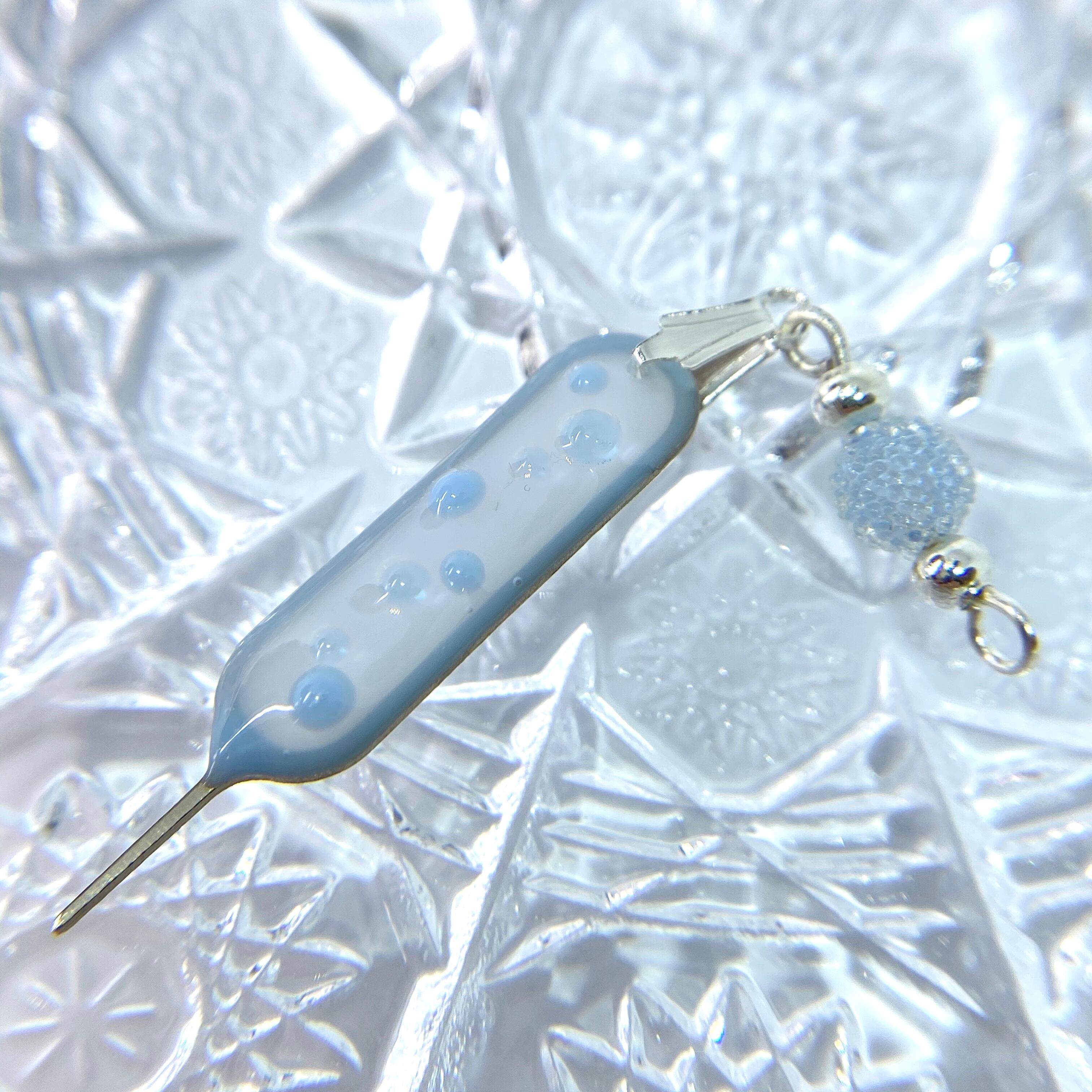 繋ぎのパーツは淡いブルーの小さな粒が可愛いアクリルビーズを使用しています