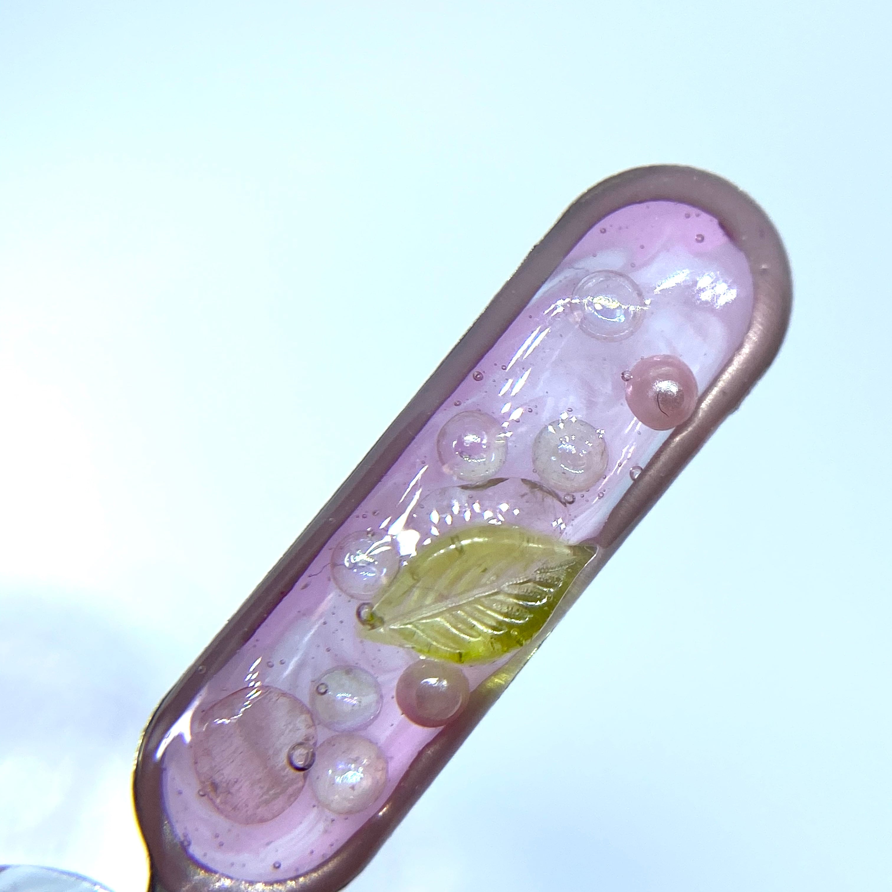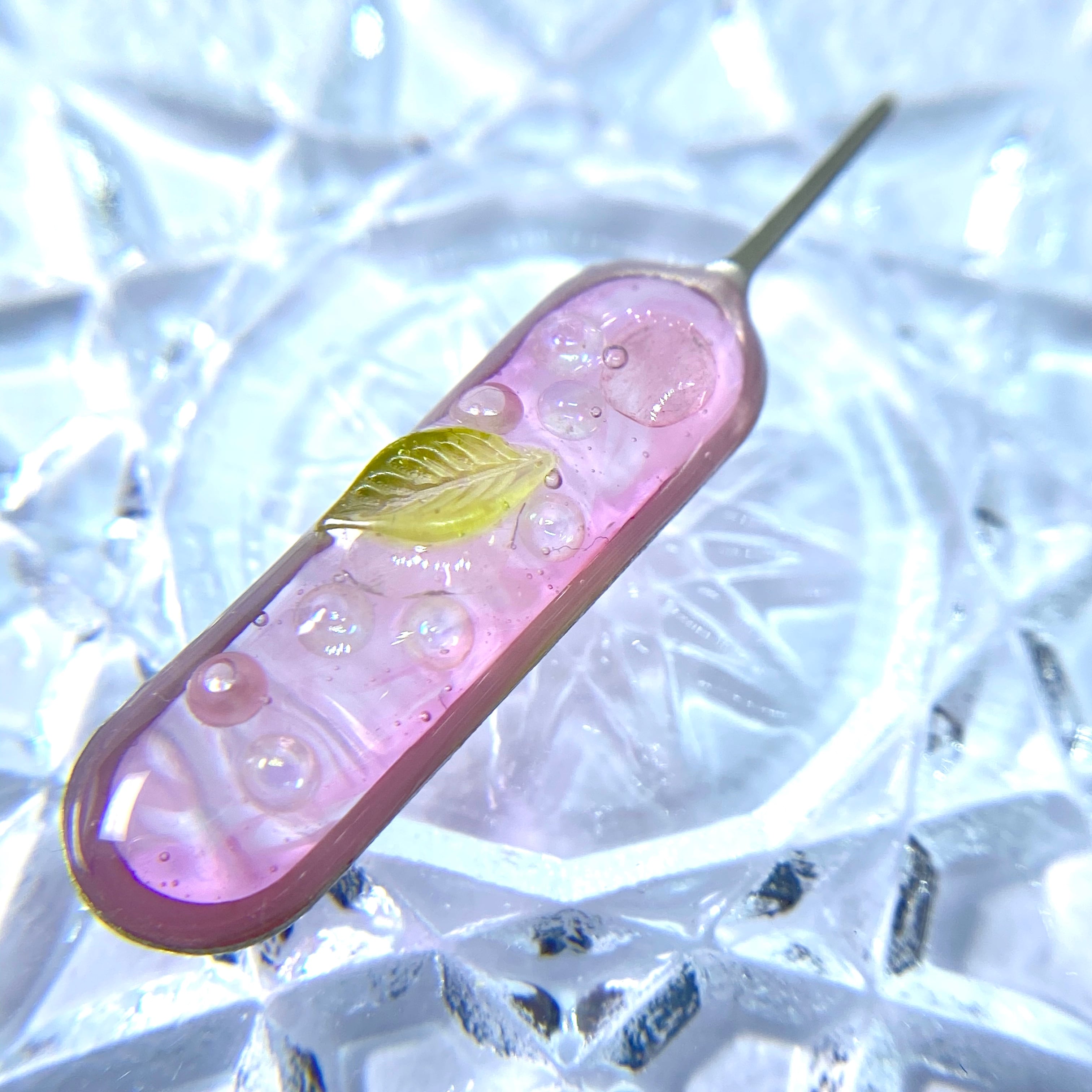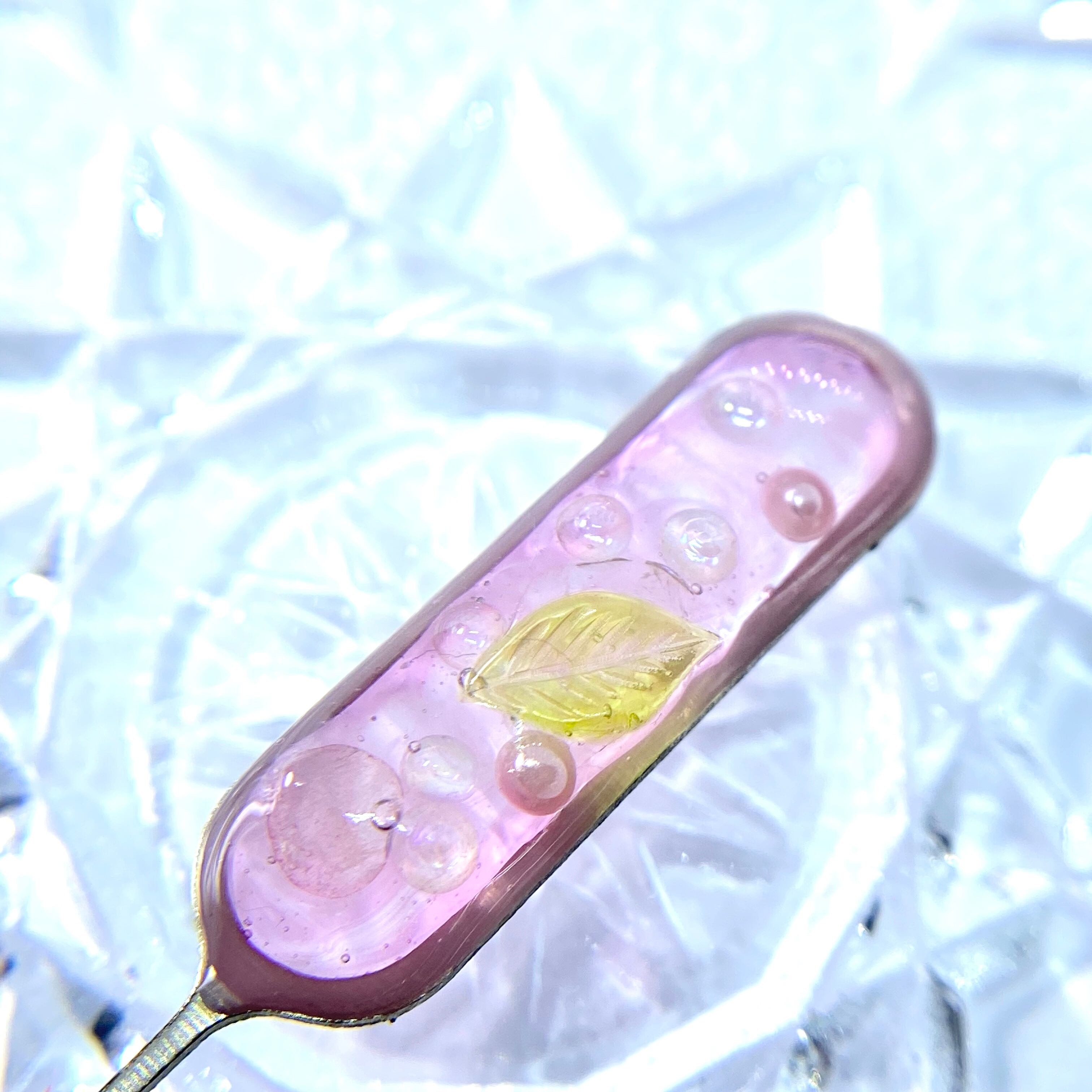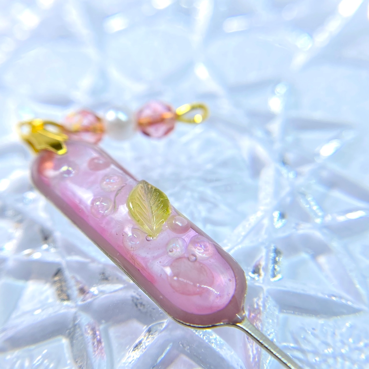 マーブルになった桃色の中に炭酸がはじける様子を小さなオーロラやガラスのビーズで表現してみました