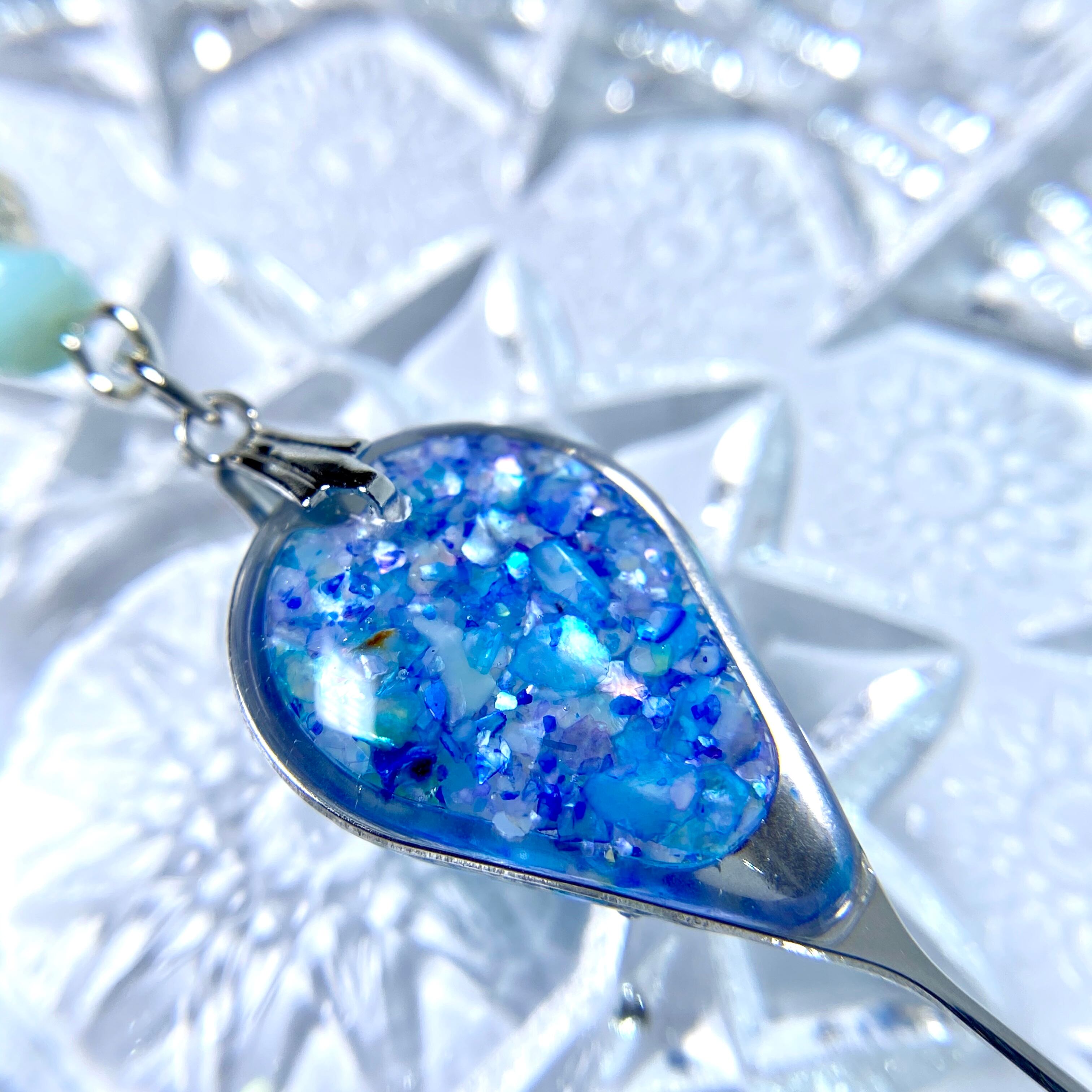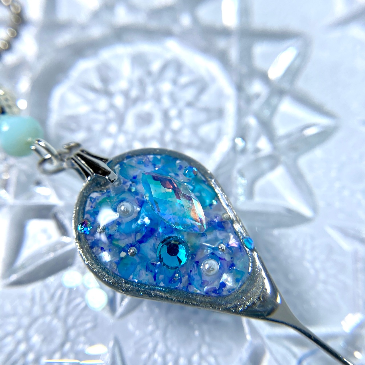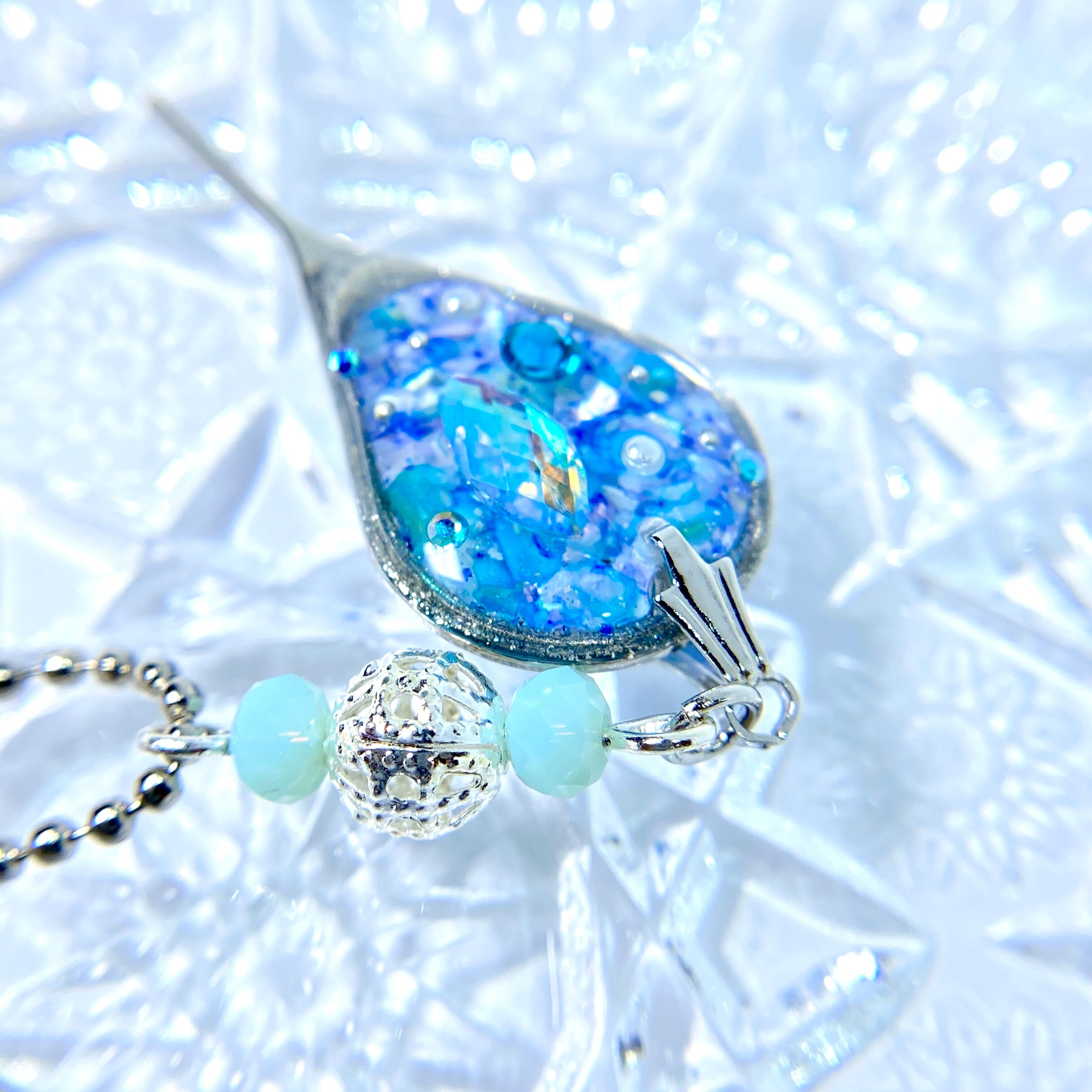 繋ぎはペールブルーのガラスビーズとシルバーの透かしビーズです☆。.:*・゜