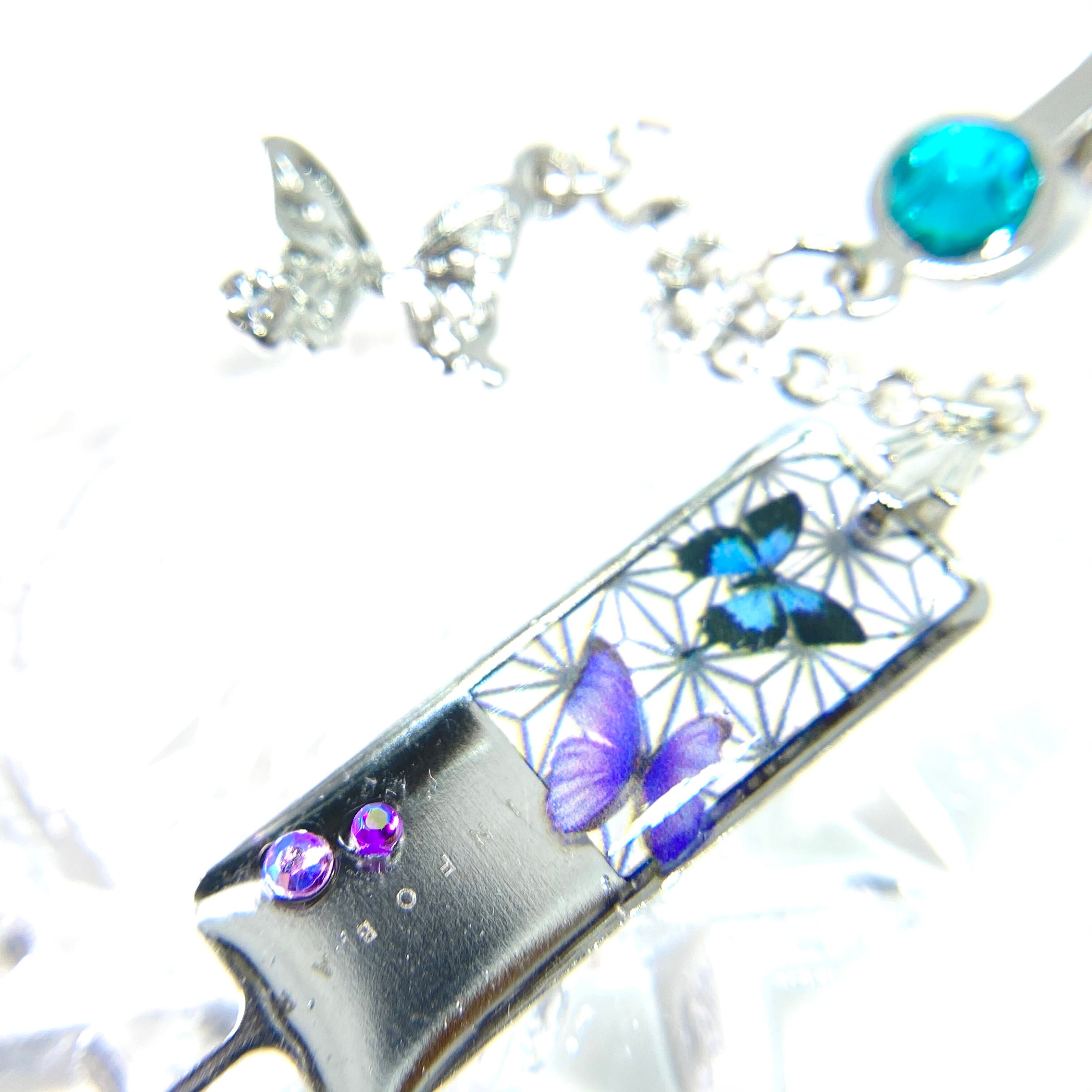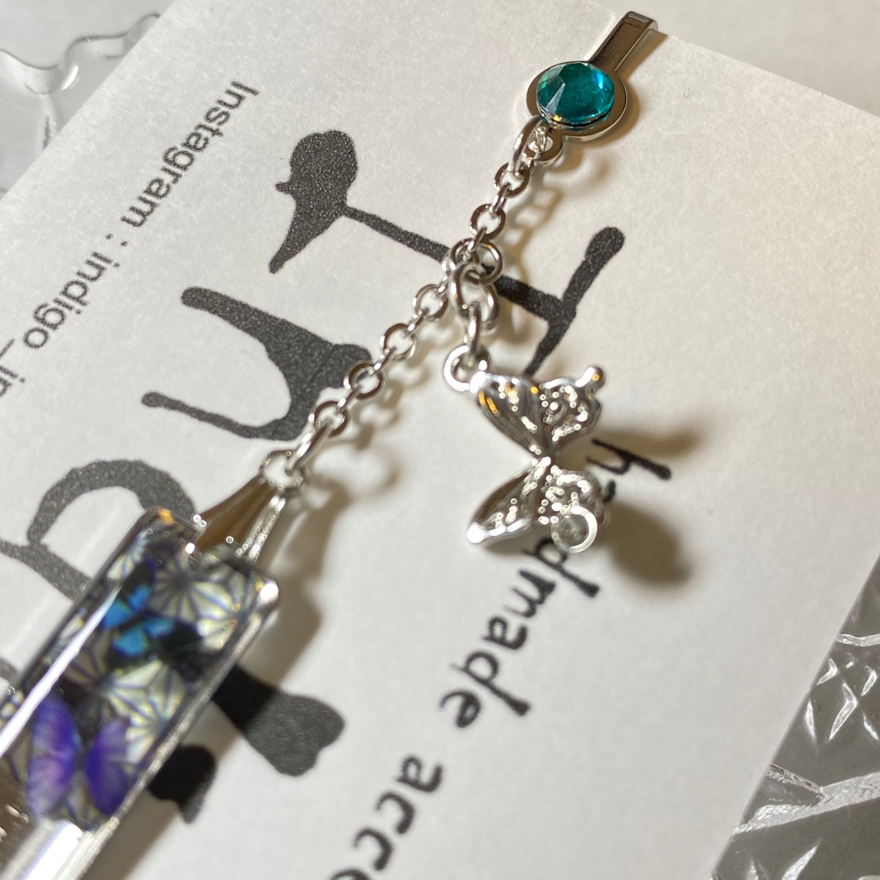 チェーンを繋ぎにして、ストーンの光る蝶々のチャーム、小さなクリップにもエメラルドカラーの大きめストーンを一粒のせています