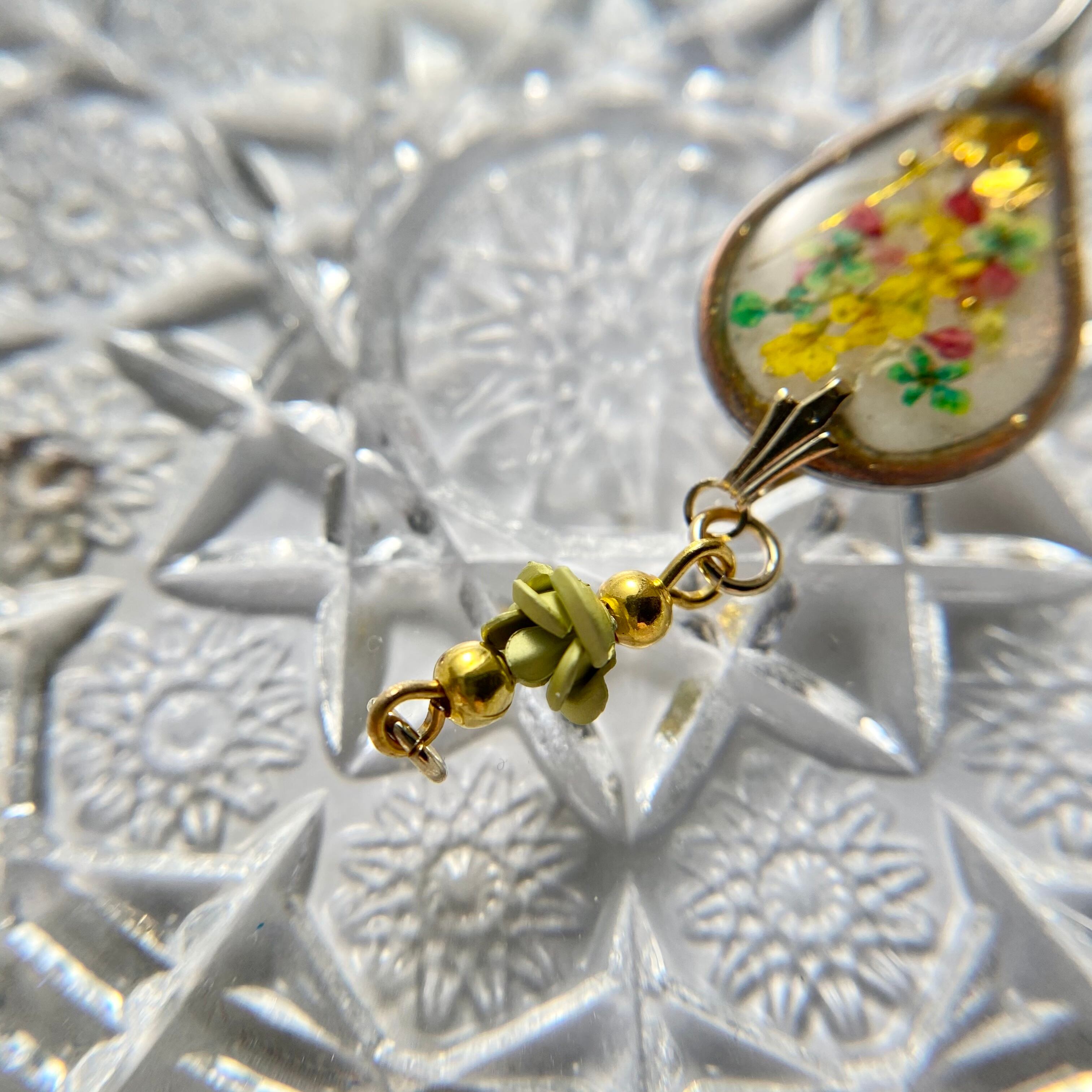 キラキラ光るココアブラウン枠に乳白色のベース、その上にカラフルなドライフラワーやゴールドパーツをバランスよく並べました☆。.:*・゜